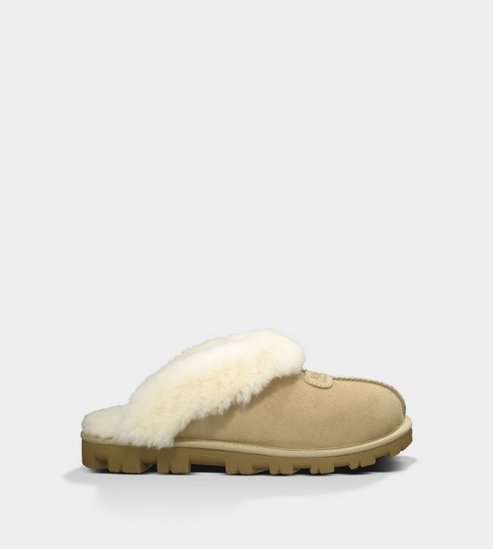 UGG® Coquette Slippers SAND features ultra-soft Twinface sheepskin in a stylishly feminine silhouette. Stay-dry, temperature-control interior meets a sturdy, molded-EVA outsole with extra tread for traction.